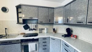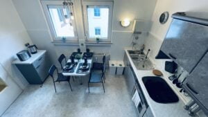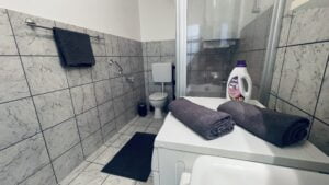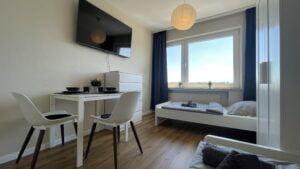 Die Unterkunft liegt im 2. Obergeschoss eines gepflegten Mehrparteienhauses. Den Gästen stehen 3 Schlafräume mit insgesamt 7 Schlafplätzen, ein Flur, eine voll ausgestattete Küche und ein Badezimmer zur Verfügung, um den Aufenthalt so angenehm wie möglich zu gestalten. Im ersten Schlafraum befinden sich 3 Einzelbetten (90×200), während der zweite Schlafraum mit 2 Einzelbetten (90×200) ausgestattet ist. Der dritte Schlafraum bietet ebenfalls 2 Einzelbetten (90×200). Sowohl das Zimmer mit den 3 Einzelbetten als auch der Schlafraum, der zum Garten hin ausgerichtet ist, verfügen über einen eigenen Balkon, der zusätzlichen Komfort und einen schönen Ausblick bietet.