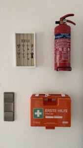 Ein Erste-Hilfe-Koffer sowie ein Feuerlöscher sind zentral im Flur der Wohnung untergebracht, um die Sicherheit während des Aufenthalts zu gewährleisten und im Notfall sofort zur Verfügung zu stehen.